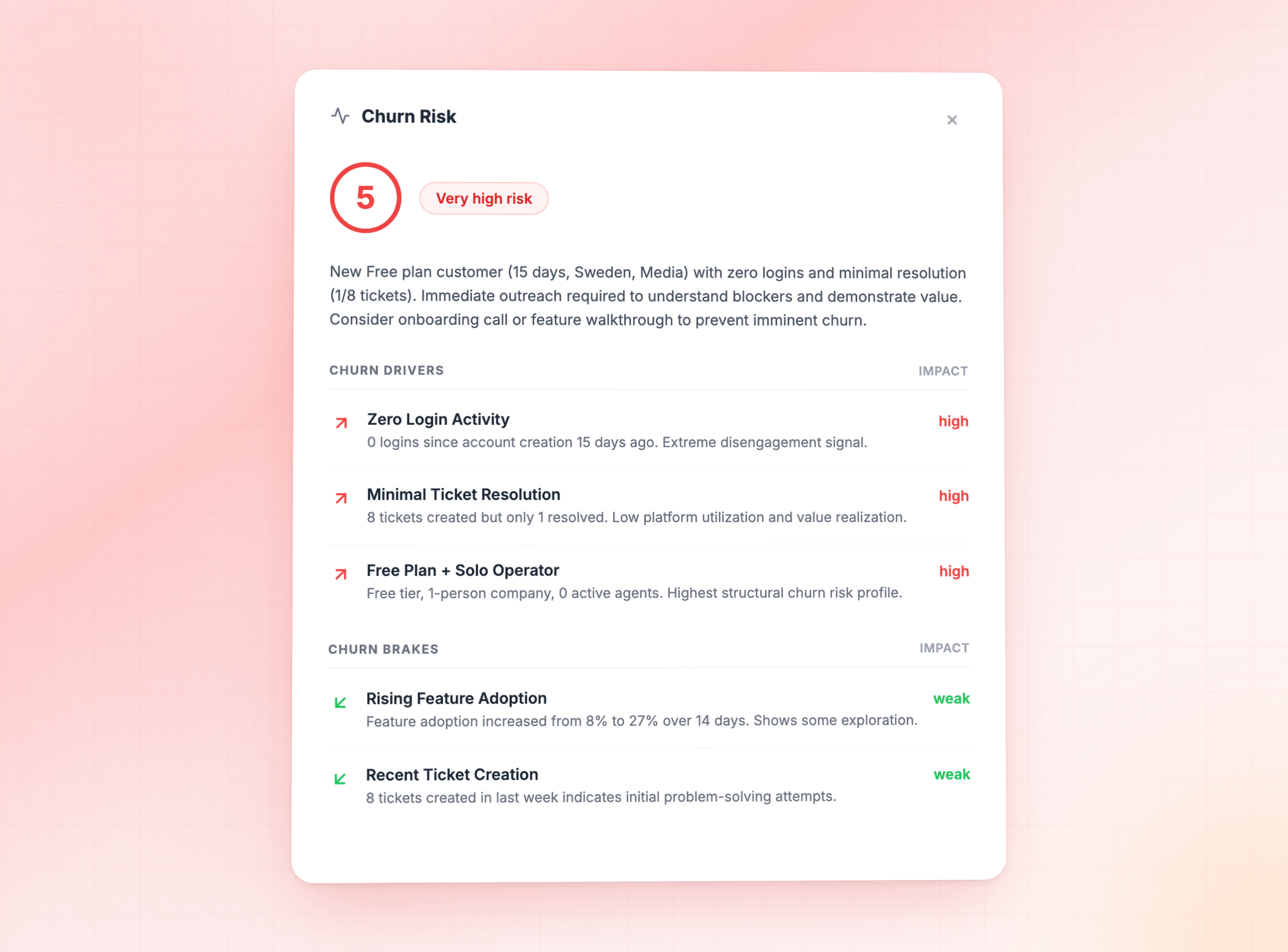 - Natural-language explanations for every score, ready to paste into a CSM handoff or exec update.