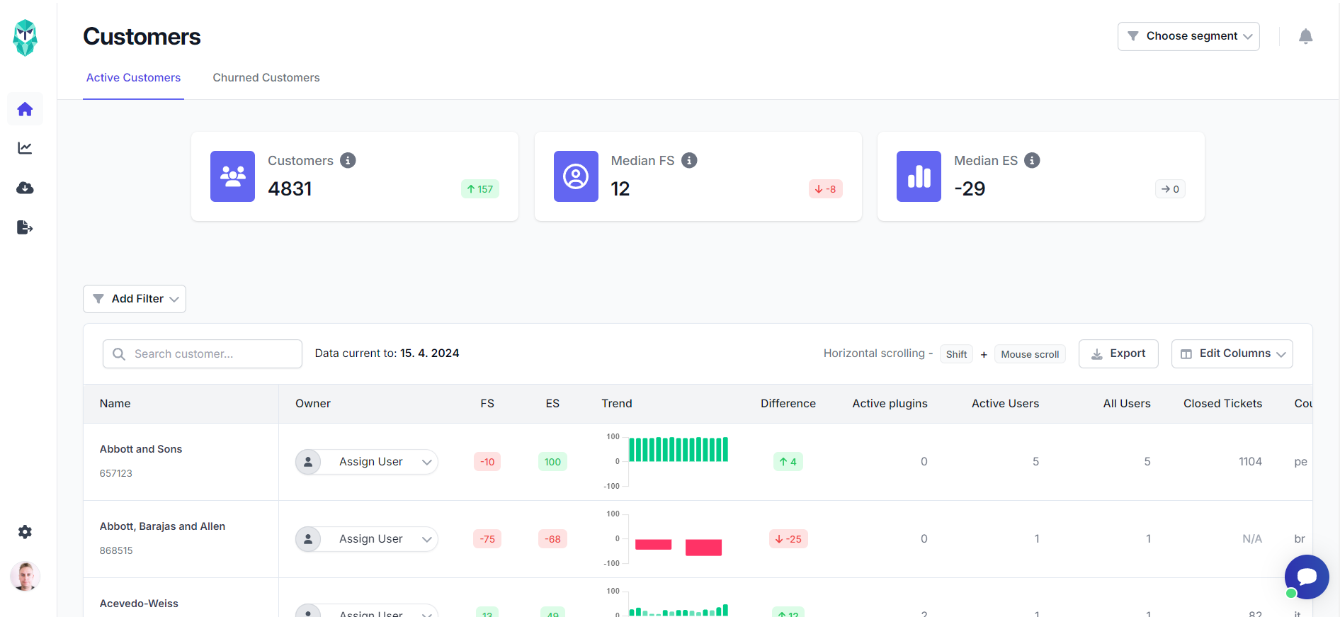 You can find the main customer statistics at the top of the pages of active or churned customers, and they are divided into three groups: Customers, Median Fit Score (FS), and Median Engagement Score (ES).
