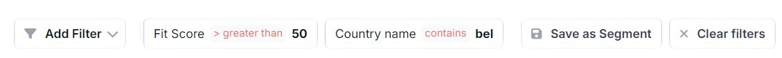 In the first field, you select the filter type. Your options include attributes such as Engagement Score, Fit Score, Owner, and others. It is also possible to filter by properties that are set up on your account. Next, you select the logical operator based on the filter type, and the last parameter is to enter the value. After clicking the "Save" button, the filter is saved to your personal profile and immediately applied to the data in the customer table.
