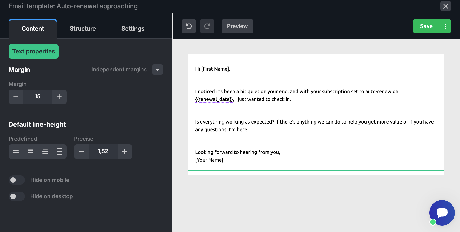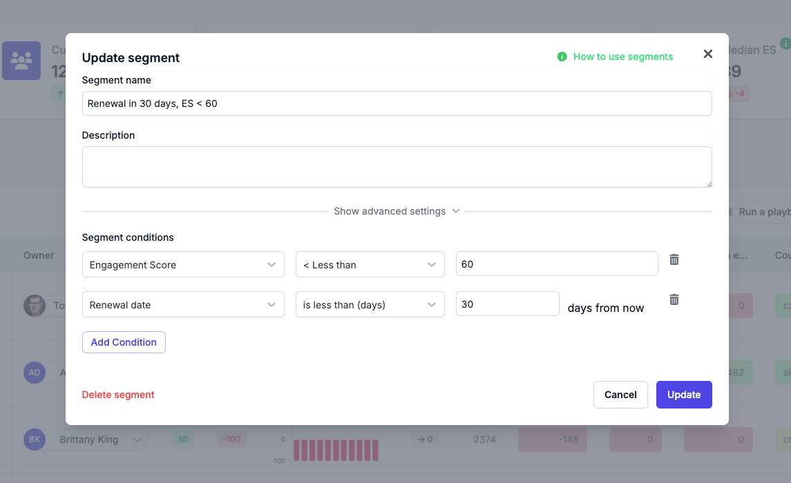 In this example, we will create a segment targeting users whose auto-renewal is in 30 days and whose engagement score is less than 60. Define segment conditions based on who you want to target.