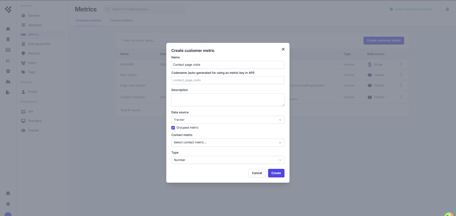 You can configure these settings in the Settings menu. Define your metrics and attributes based on the level (Customer vs. Contact) you wish to track: