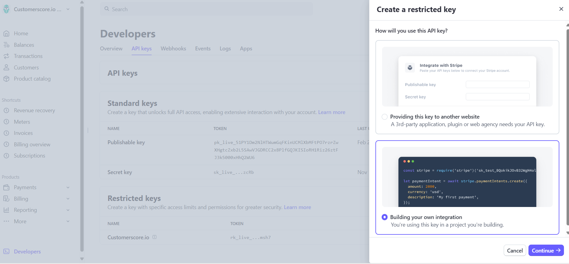 - Log in to your Stripe account and navigate to the Developers section (found in the lower-left corner). Then, go to the API keys tab. Under the Restricted keys section, click on Create restricted key. In the popup window, choose Building your own integration, and proceed to the next step.
