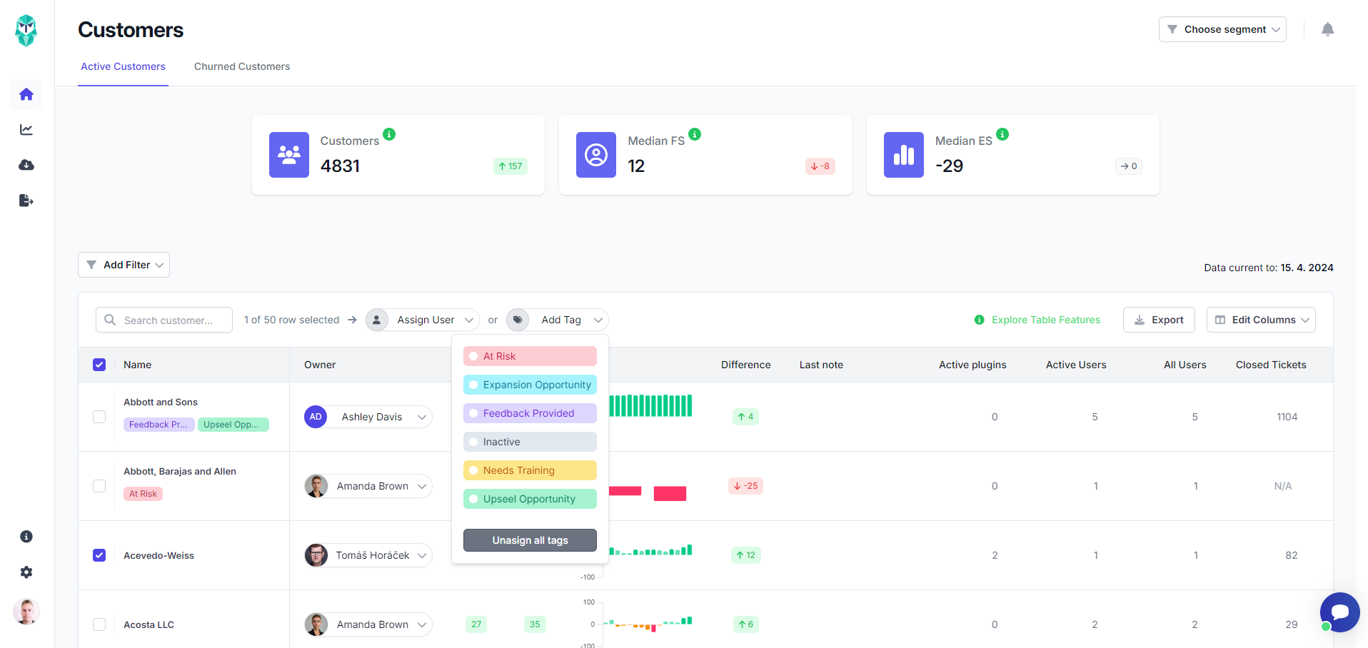 1) The first method is bulk tagging by selecting customers in the table of customers and clicking the "Add Tag" button. Once a tag is selected, all chosen customers will receive that tag. Tags can also be removed by clicking "Unassign all tags". Please note, that this action will remove all tags from all selected customers.