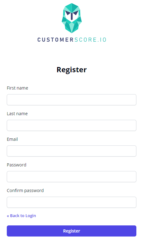 All fields are required. The email address must be unique within the application, and you will need to verify it immediately after registration. Only verified users will have full access to Customerscore.io.