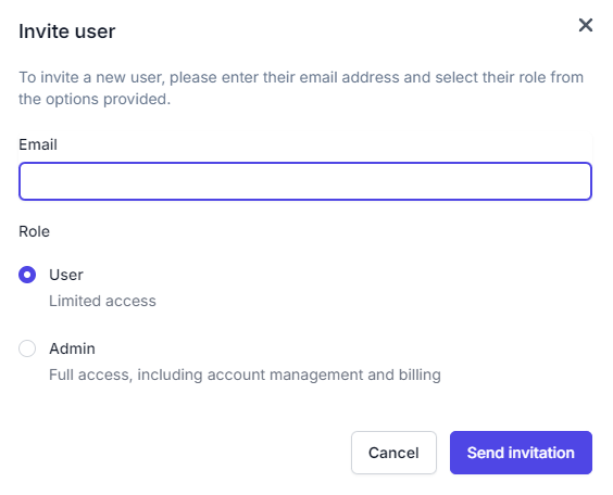 Enter the email of the person and set their role. After clicking "Send invitation", an invitation email will be sent with further instructions. The invited user will be automatically assigned to your corporate account.