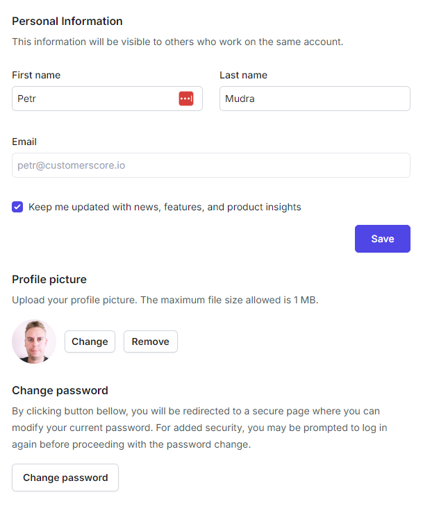 Here, you can update your first name, last name, or profile picture. You can also unsubscribe from receiving newsletters about our application and change your login password.